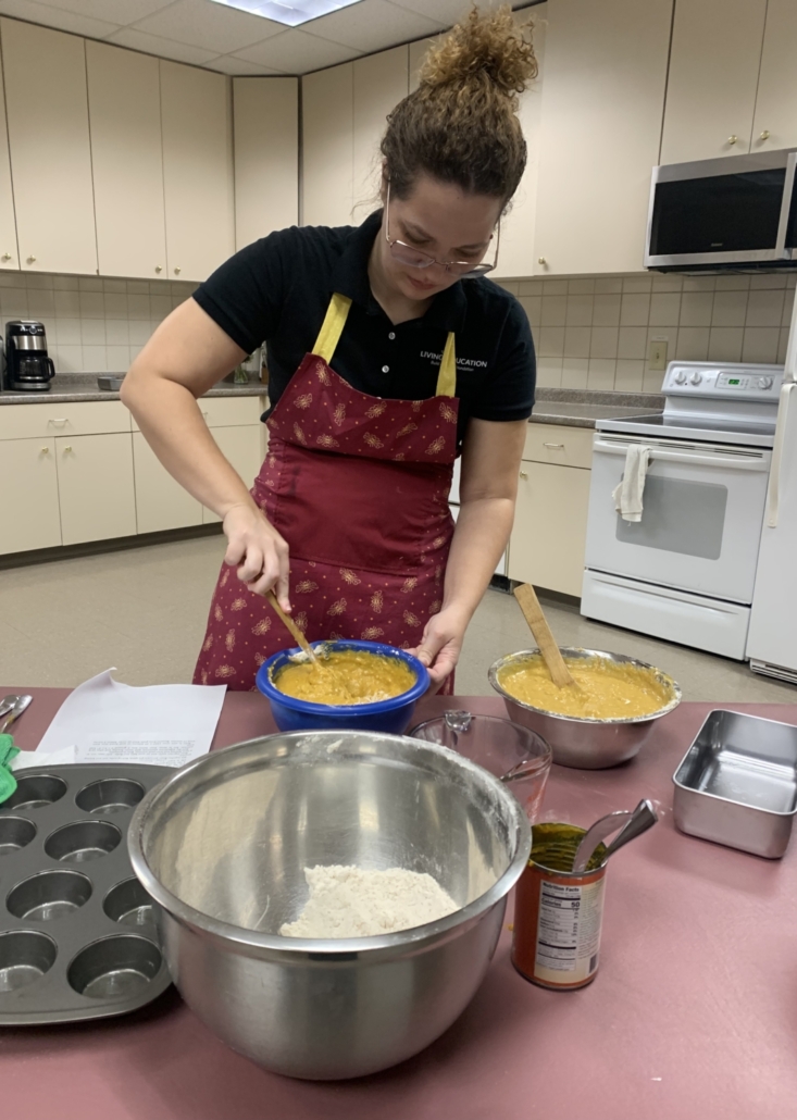 The Living Education ladies baked pumpkin spice loaves and muffins in a recent life roles class in the Church HQ kitchen to learn how to read a recipe and to serve their local neighbors by their dorm. The students used a well-loved recipe of Mrs. McNair; she explained to them how to make substitutions, such as honey to replace sugar and walnuts instead of dates or raisins. Gift boxes were put together along with cards, and the baked goods were carefully placed inside. When the ladies returned to their dorm at the end of the day, each one was assigned to a neighbor’s house to gift their pumpkin spice loaves. Gifting handmade baked goods was an opportunity to show goodwill towards the neighbors and help them have a great Thanksgiving!